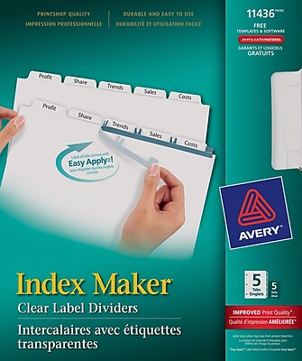 Avery IndexMaker Print & Apply Label Dividers, 5-Tab, Clear, 5/Pack (11436) Label all 5 tab dividers at once with the Index Maker Easy Apply Label strip that results in five perfectly aligned sets of tabs Get a professional, printed-on look with clear labels that virtually disappear on the white divider tabs $48.49 5/pack $9.70/Set Delivered FREE in 1- 2 days $48.49 1-Hour pick up $48.49 Auto Restock $46.07 Save $ 2.42