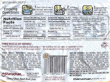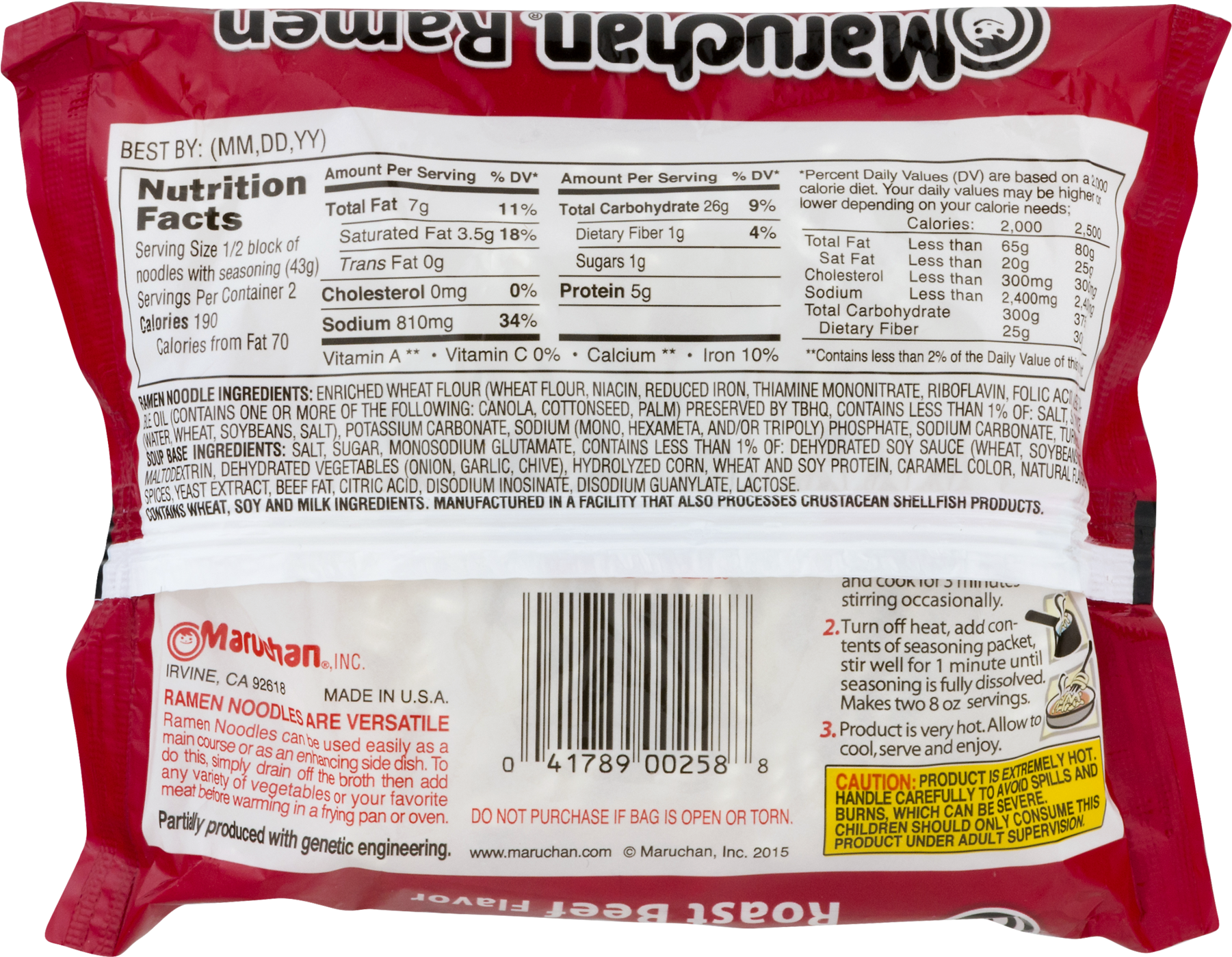 Maruchan ramen label. Ramen Nutrition Facts and How to Make Them Healthier 12.07.2021 · Instant ramen noodles (or cup noodles) are dehydrated noodles that come with soup-flavored powders. They're inexpensive and easy to prepare—just add hot water and in about three minutes you have a meal. The problem, however, is these packaged noodles are high in fat and sodium and not all that nutritious. Take a look at the label and you'll see there are two … Nissin Foods - Wikipedia The company was established in Japan on September 1, 1948, by Taiwanese immigrant Go Pek-Hok (1910–2007), Japanese name Momofuku Ando (the creator of instant ramen in 1958) as Chuko Sosha (中交総社, Chuukou-sousha). Ten years later, the company introduced the first instant ramen noodle product, Chikin Ramen (Chicken Ramen). Soon thereafter, the company … Soups | Hannaford Maruchan Beef Ramen Noodles. $3.45. $1.53/Per pound. Add To List Added to List. each. 4.12 Oz. Maruchan Yakisoba Korean BBQ Flavor Japanese Noodles. $1.05. $4.08/Per pound. Add To List Added to List. each. 32 Oz. Hannaford Beef Stock. $2.29. $1.15/Per pound. Add To List Added to List. each. 10.5 Oz. Campbell's Healthy Request Homestyle Chicken Soup . $1.89. … Maruchan Chicken Ramen Noodle Soup Cup - 2.25oz : Target Take your snack or lunch on-the-go with Maruchan Ramen Noodle Soup Mix with Chicken Flavor - 2.25 oz. This economical and tasty meal option takes just 3 minutes to prepare once you add boiling water, and can be easily jazzed up with your choice of extra ingredients such as egg, veggies or meat.