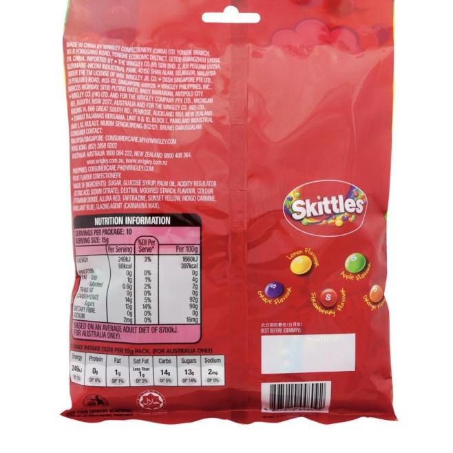 SKITTLES Squishy Cloudz Fruits Sweets Bag 94g | SKITTLES® Nutrition information per 100g Energy 1354kJ / 318 kcal Fat 0.5g of which saturates ... Please refer to the product label for the most accurate nutrition, ingredient, and allergen information. ... SKITTLES Giants Fruits Sweets Bag 45g SEE DETAILS. Where To Buy. SKITTLES Fruits Sweets Fun Size Bags Multipack 10 x 18g SEE DETAILS. Where To Buy ...