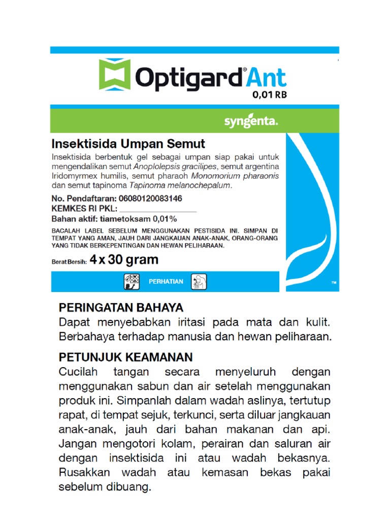 Label & SDS Documents | Syngenta PPM Optigard Ant Bait Gel Label 152.14 kb. Talon Rat & Mouse Killer Pellets Label 226.75 kb. Talon XT Pro Rodenticide Label 207.7 kb. SDS Downloads . Advion Ant Gel SDS 136.51 kb. Advion Cockroach Gel SDS 304.66 kb. Advion Fire Ant Bait SDS 135.63 kb. Altriset Termiticide SDS 146.79 kb. OPTIGARD Ant Gel Bait | Syngenta PPM OPTIGARD remains highly palatable for at least 14 days. If ants are still present after that time, this means a new or large colony is present and re-treatment may be necessary; Have both ADVION Ant Gel and OPTIGARD Ant Bait Gel with you, and do a taste test for which species you are dealing with. By having both products at your disposal, all ... PDF U.S. EPA, Pesticides, Label, OPTIGARD ANT GEL BAIT, 9/21/2010 Subject: Label Amendment; Revised Container Handling Statements Optigard Ant Gel Bait EPA Registration No. 100-1260 Submission Date: August 13,2010 The labeling referred to above, submitted in connection with registration under the Federal Insecticide, Fungicide, and Rodenticide Act, as amended, is acceptable with the following provision: 1.