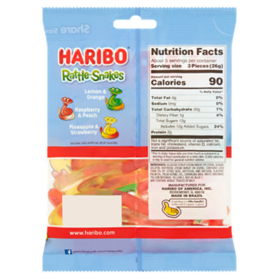 HARIBO Peaches The world's first gummi-entertainment network. Stream now on Instagram. Nutritional values Ingredients. Serving Size: 4 pieces (30g) Calories. 100. Fat. 0g. Haribo Gummy Bears Nutrition Facts - Eat This Much Mountain Man Nut & Fruit Co. Nutrition Facts. For a Serving Size of 17 pieces ( 39 g) How many calories are in Haribo Gummy Bears? Amount of calories in Haribo Gummy Bears: Calories 140. Calories from Fat 0 ( 0 %) % Daily Value *. How much fat is in Haribo Gummy Bears? Haribo Nutrition Facts - GroceryNutrition.org Select a Haribo product below to view the full nutrition facts, Weight Watchers points and ingredients. Our database currently contains 17 items from Haribo. Cold-bears Gummy Candy, Sour Fizzy Cola Gummi Candy, Sour Sweet & Tangy! Fruit Salad Gummi Candy, Cherry Orange Peach Grapefruit Lemon Passion Fruit Gold-bears Gummi Candy, Original › halloween-candy › sAmazon.com: Halloween Candy SKITTLES, STARBURST Original, STARBURST Fave Reds, & LIFE SAVERS Gummies Halloween Candy Mix, 44.07 oz. 150-Piece Bag 44.07 Ounce (Pack of 1) 4.7 out of 5 stars 3,073