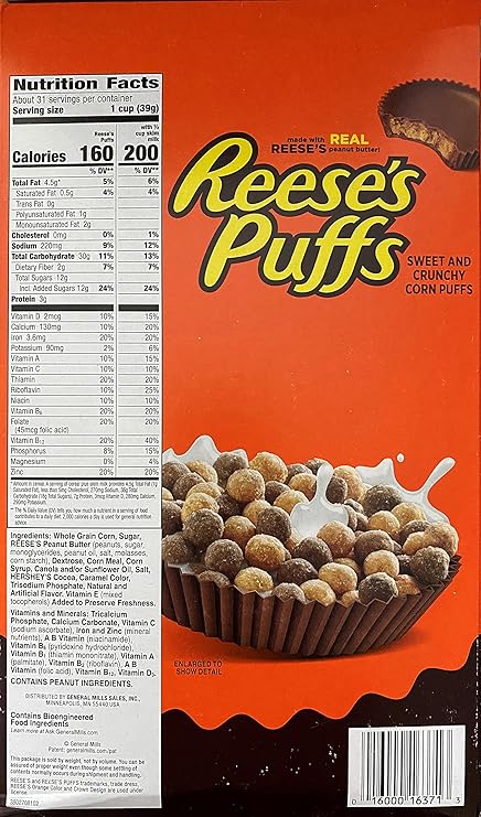 Reese's Puffs | Peanut Butter Cereal | General Mills Cereal Tricalcium Phosphate, Calcium Carbonate, Zinc and Iron (mineral nutrients), Vitamin C (sodium ascorbate), A B Vitamin (niacinamide), Vitamin B6 (pyridoxine hydrochloride), Vitamin B2 (riboflavin), Vitamin B1 (thiamin mononitrate), Vitamin A (palmitate), A B Vitamin (folic acid), Vitamin B12, Vitamin D3 . Nutrition Facts Serving Size: 3/4 cup (29g)