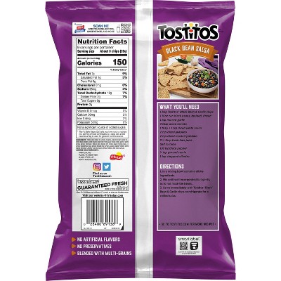 Tostitos Nutrition Facts Select a Tostitos product below to view the full nutrition facts, Weight Watchers points and ingredients. Our database currently contains 56 items from Tostitos. 10.00oz Scoops 16.00oz Scoops 32.00oz Thick Cut Yellow Corn 45.00oz Queso 9.00oz Blue Corn Rstc Baked Tortilla Chips Bite Size Tortilla Chips Bite Size Tortilla Chips 13 Ounce Plastic Bag Tostitos - Tostitos® Multigrain Rounds Tortilla Chips | Tasty Rewards Nutrition Amount per 50 g serving (34 chips) % Daily Value Calories 260 Fat 13 g 20 % Saturated 1.5 g 9 % + Trans 0 g Cholesterol 0 mg 0 % Sodium 200 mg 9 % Carbohydrate 33 g 11 % Fibre 3 g 13 % Sugars 1 g Protein 3 g Vitamin A 0 % Vitamin C 0 % Calcium 4 % Iron 6 % Ingredients Tostitos Multigrain Tortilla Chips, 9 Oz. - Walmart.com 9 Servings Per Container Amount per serving Calories 140 * The % Daily Value (DV) tells you how much a nutrient in a serving of food contributes to a daily diet. Calories per gram: Fat 9 • Carbohydrate 4 • Protein 4 Product details Enjoy Tostitos Multigrain Tortilla Chips at your next fiesta.