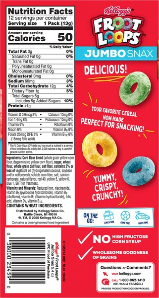 Kellogg's Froot Loops Cereal 19.4oz Box | Garden Grocer Natural fruit flavors. Good source of fiber. Same great taste! ... Sweetened multi-grain cereal. 110 calories per serving. 1 g total fat (2%), 135 mg sodium (6%), 12 g sugars per serving, 3 g fiber (11%), vitamin D (10%). ... (One or More of: Coconut, Soybean and/or Cottonseed Oils) (Less than 0.5g Trans Fat per Serving), Salt, Sodium Ascorbate ...